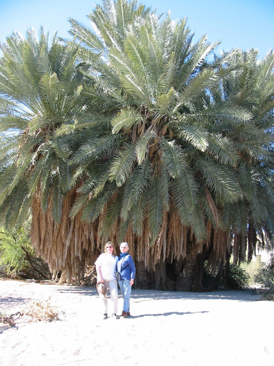 Jackie and Mary Lou pose in front of a massive palm tree near Hot
